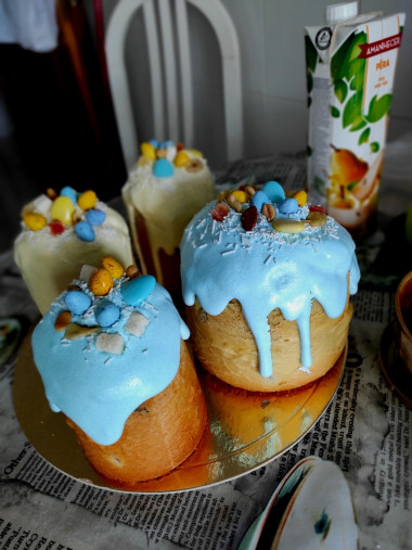 Спасибо большое за рецепт! Куличи получились высокими, ароматными, красивыми, и легкими в приготовлении даже для меня - а я готовила их впервые. Количество теста идеально подошло и для 5 формочек, но, так как я не большая любительница изюма, его я взяла немного меньше - 200 грамм. Правда, при выпечке в течение 40 минут верх неожиданно сильно запёкся, что пришлось маскировать глазурью, но даже так всё очень хорошо. Хороших всем праздников и спасибо ещё раз :)