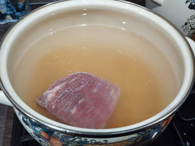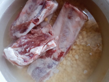 В кастрюлю налейте воду, положите мясо и горох, поставьте на огонь. После закипания, снимите пенку шумовкой или мелким ситечком, убавьте огонь и накройте крышкой. Варите примерно 60 минут, периодически удаляя пену. С выбором идеальной кастрюли поможет статья о кастрюлях, ссылка в конце рецепта.