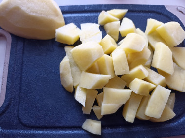 Картофель нарежьте на небольшие кубики и залейте водой, чтобы он не потемнел, пока дожидается свой очереди отправки в суп. Проверьте мясо на готовность. Если вилка или нож легко входят в него, то можно вынуть говядину из кастрюли. Положите в суп картофель и лавровый лист. Мясо немного остудите, отделите от кости, нарежьте на порции и верните обратно в бульон. Варите суп 10-15 минут до готовности картофеля. Точное время зависит от сорта картофеля.