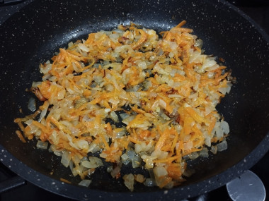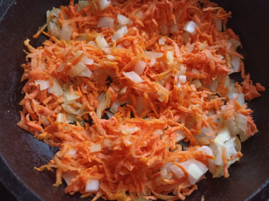 На разогретую сковороду налейте растительное масло. Затем добавьте лук и морковь. Аккуратно помешивая, доведите лук до полупрозрачного состояния.