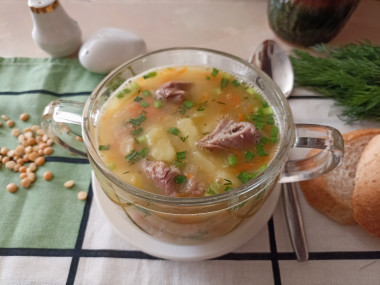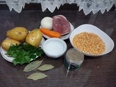 Горох несколько раз промыла до прозрачной воды. Поставила мясо и горох вариться. В это время сделала пережарку из моркови и лука. Картофель очистила и нарезала небольшими кубиками. Кусок мяса достала с бульона, порезала небольшими брусочками. Отправила опять в кастрюлю. Добавила пережарку,картофель, соль и проварила до готовности. В конце добавила измельчённую зелень сельдерея.