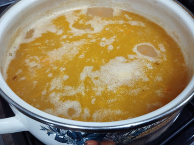 Простите, а горох на каком этапе сыпать в суп? В рецепте не увидел. Может пропустил?