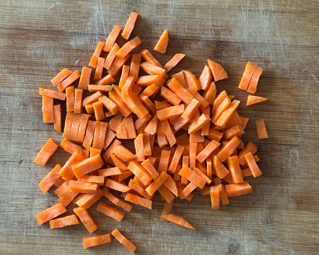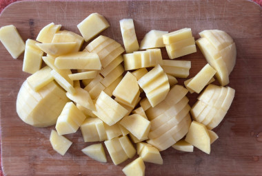 Всё тщательно промойте и снимите кожуру овощечисткой или другим удобным для вас способом. Лук порежьте мелким кубиком. Морковь натрите на крупной терке. Картофель нарежьте на небольшие кубики и залейте водой, чтобы он не потемнел, пока дожидается свой очереди отправки в суп.Шаг 5. Как сделать зажарку для супа?