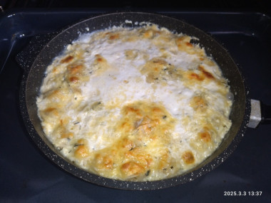 Пельмени заливала смесью молока и воды. Добавила укропа замороженного для аромата. Запекала на 200 град, 20 минут под фольгой и 30 минут открытыми.
