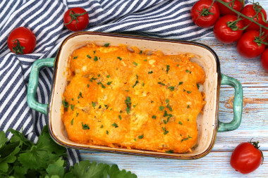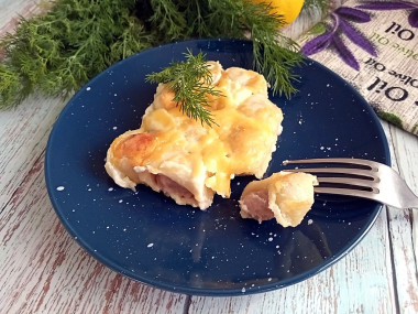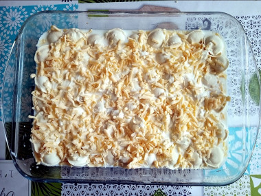 У меня было 700 г. небольших пельменей. Форму я выбрала прямоугольную стеклянную. Смазала ее растительным маслом, выложила пельмени и залила молоком в количестве 400 мл. Думаю, это больше зависит от ширины формы. Смазала майонезом, посыпала сыром и запекала 40 минут. Потом 20 минут без фольги. Время запекания продлила, т. к. молоко до конца не впитывалось. В конце выпекания все же молоко практически испарилось, а верх зарумянился. Получилась вкусная запеканка! Тесто стало нежным, мясная начинка хорошо приготовилась. Сверху вкусная сырная корочка). Это очень простой способ приготовить сытный обед из любимых пельменей.