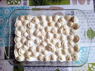 Залейте пельмени молоком так, чтобы оно доходило примерно до половины. У меня ушло меньше молока, чем указано по рецепту, потому что пельмени лежали в один ряд.