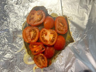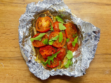 Помидоры нарежьте тонкими кружочками и выложите поверх камбалы как на фото. В среднем понадобится один помидор на одну порцию рыбы.