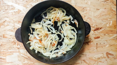 На подсолнечном масле обжарьте до прозрачности крупно нарезанный репчатый лук. немножко его присолите, поперчите, при желании добавьте пряные травы.