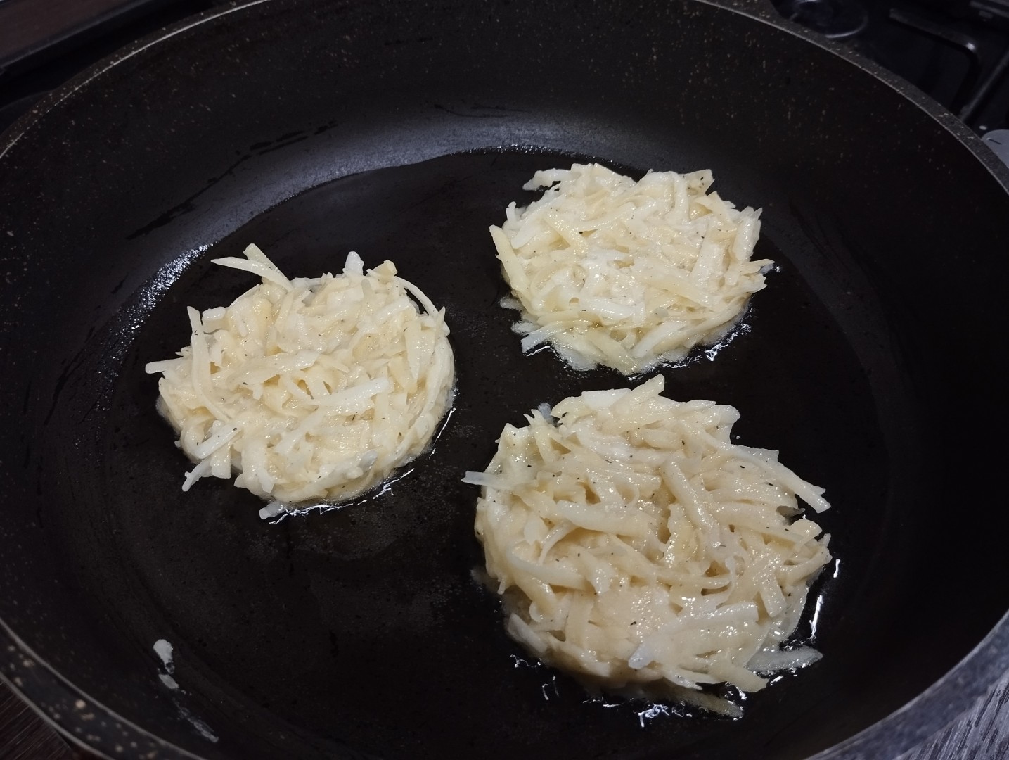 Формировала круглые хашбрауны на сковороде при помощи кулинарной формочки и обжаривала с двух сторон.