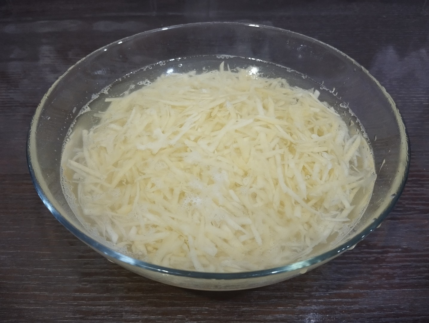 Тертый картофель переложите в миску с чистой холодной водой на 5 минут чтобы удалить лишний крахмал. Можете также промыть картошку несколько раз в проточной воде. Поначалу вода будет белесой от крахмала, но постепенно станет прозрачной.