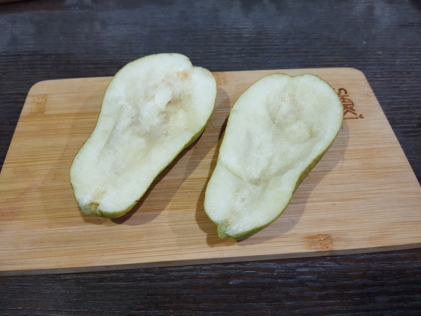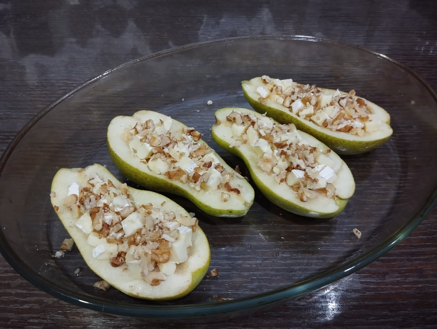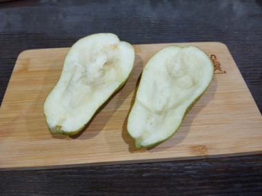 Сразу поставьте разогревать духовку на 200°С, так как подготовка не займет у вас много времени. Груши хорошо помойте и обсушите бумажными полотенцами. Разрежьте их на половинки. Затем чайной ложкой с тонким краем выскоблите серединку с семенами. Углубление сделайте довольно большое, чтобы в него уместился сыр.