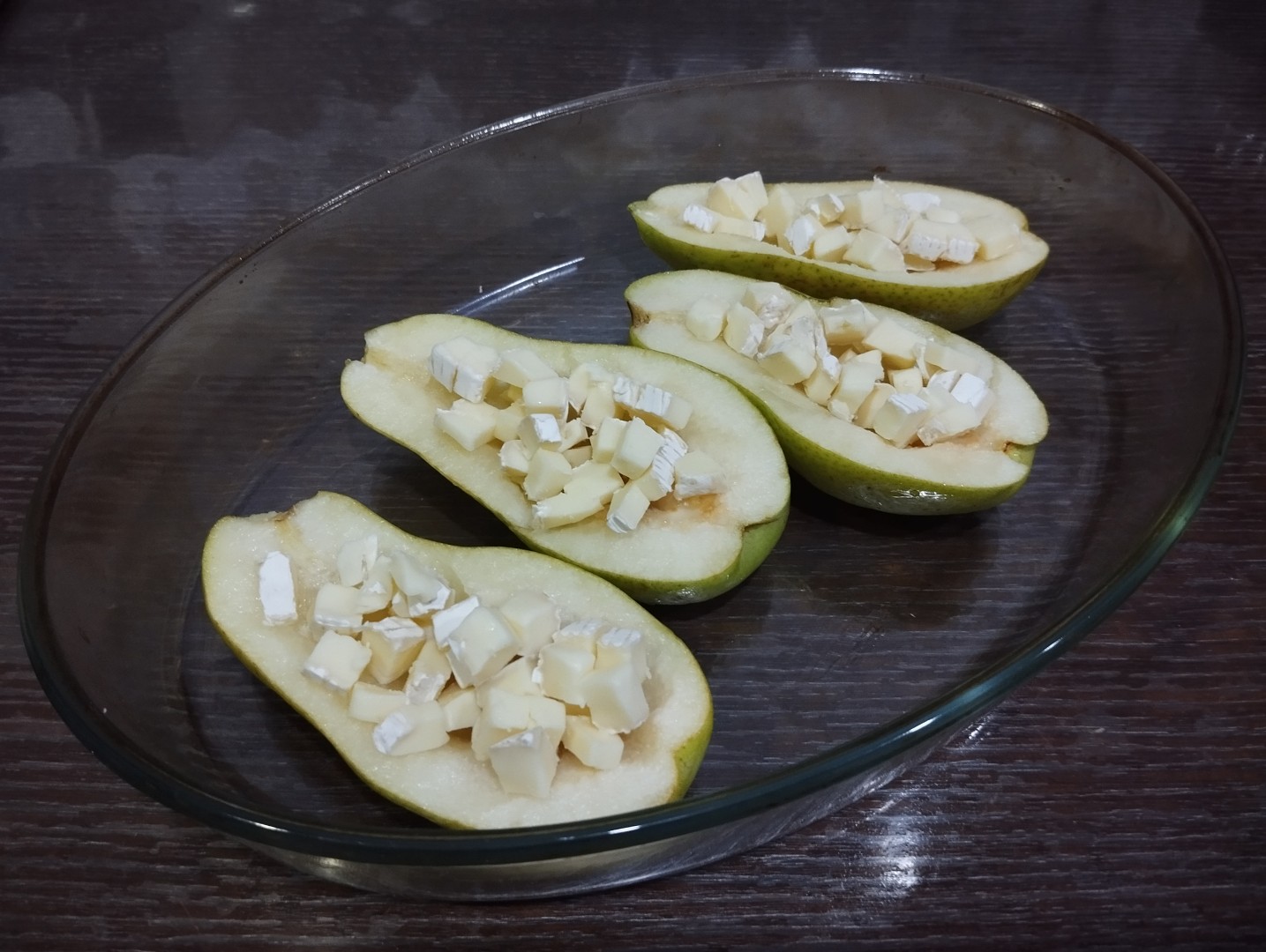 Возьмите форму, подходящую для запекания в духовке. С выбором поможет отдельная статья по ссылке в конце рецепта. Выложите в форму половинки груш. В вырезанные углубления выложите кусочки сыра.