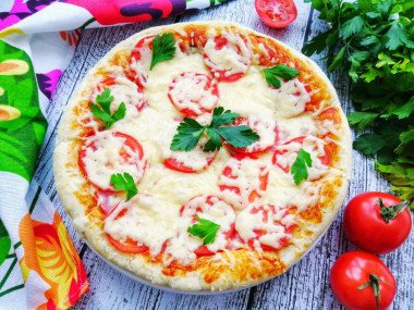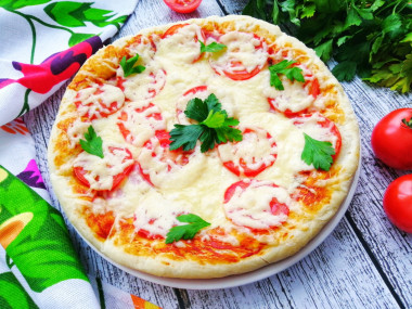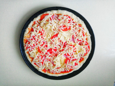Замешивала тесто для пиццы на молоке. Использовала при замесе также дрожжи, растительное масло, соль и муку. От себя добавила еще две чайные ложечки сахара. Такой состав теста - мой любимый, он довольно простой, а тесто при выпечке получается замечательное - мягкое, с приятным хлебным ароматом.