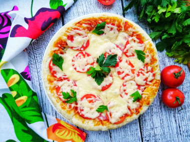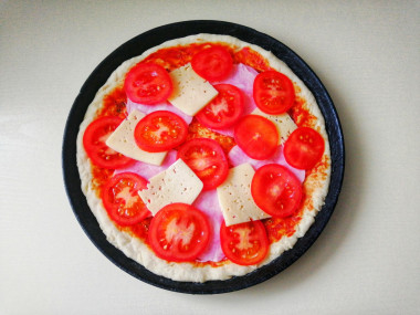 Сделала сегодня пиццу дрожжевую на молоке на перекус по этому рецепту. Правда пришлось заменить некоторые продукты для начинки, вместо копченой колбасы взять ветчину, а вместо моцареллы - твёрдый сыр.