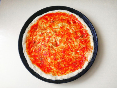 Подошедшее тесто раскатайте и распределите по форме для пиццы (Ø 25-30 см). Я раскатала тесто на пергаменте и перенесла его на противень. О том, как выбрать форму для запекания, читайте в отдельной статье по ссылке в конце рецепта. Сверху смажьте поверхность теста томатным соусом и посыпьте сушеным орегано.