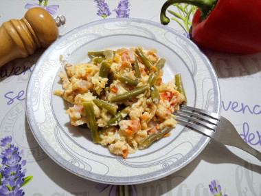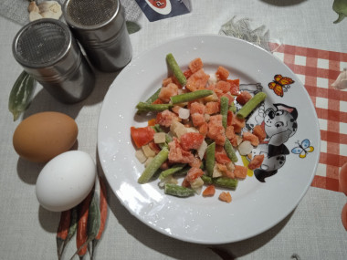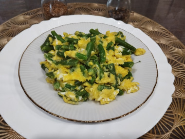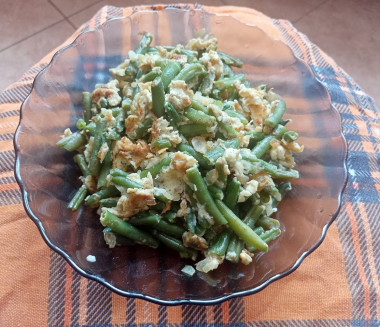 Сделала завтрак, взяв за основу этот рецепт. У меня была замороженная стручковая фасоль в комплексе с луком, перцем и помидором. Сначала я овощи потушила на маленьком огне под крышкой. Яйца взболтала вилочкой, посолив и поперчив. Влила яичную массу в сковороду к овощам и на среднем огне готовила, помешивая. Получилось вроде скрэмбла с овощами. Яйца хорошо приготовились и я переложила блюдо на тарелку. Стручковая фасоль с яйцом это вкусно и полезно. Получилось сытно, ярко и очень аппетитно. Подавала на завтрак с ломтиком хлеба. Заряд бодрости на целый день. Отличный рецепт. Благодарю автора 😊
