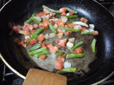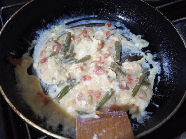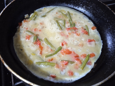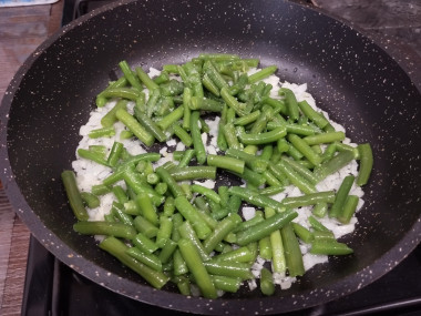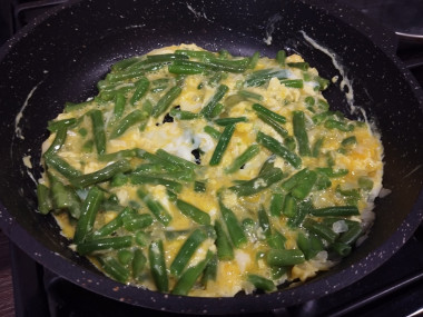 Фасоль отварила несколько минут. Воду слила и залила холодной водой ( по совету автора) для сохранения цвета. Чеснок и лук измельчила и обжарила на сковороде. Добавила фасоль,немного вместе обжарила. Затем залила слегка взбитыми яйцами,перемешала и довела до готовности.