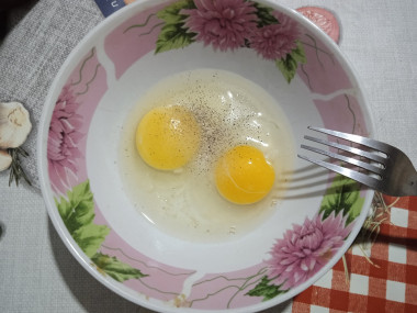 Затем выложите в сковороду фасоль, перемешайте. Яйца вбейте в пиалу. Взболтайте их вилкой до смешивания белков и желтков. Вылейте яйца на сковороду к фасоли. Посолите и поперчите блюдо.