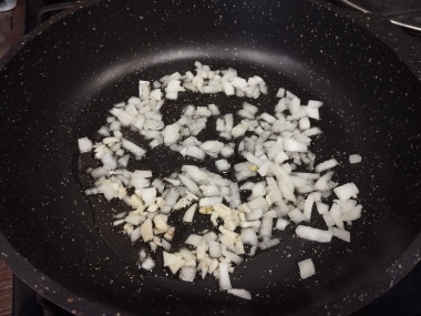 Нагрейте на среднем огне сковороду, налейте на нее растительное масло. Выложите в масло нарезанные лук и чеснок. Обжарьте их, помешивая, пару минут, до мягкости. О том, как подобрать идеальную сковороду, а также как правильно выбрать масло для жарки, читайте в отдельных статьях, ссылки в конце рецепта.
