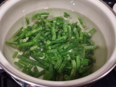Вскипятите в сотейнике воду, добавьте в нее соль. Закиньте фасоль. Проварите ее 3-4 минуты, затем воду слейте.