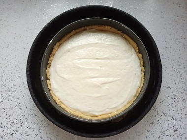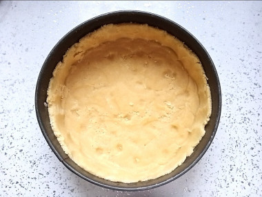 В застеленную пергаментом форму (Ø 20-22 см) высыпьте половину песочной крошки и утрамбуйте, делая невысокие бортики. Информацию о формах для выпечки вы найдете в конце рецепта под шагами.