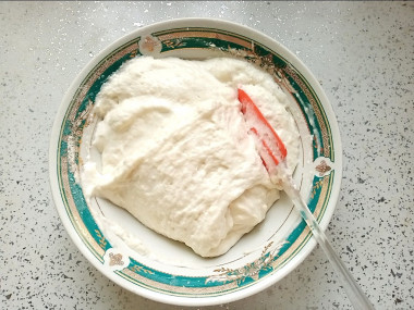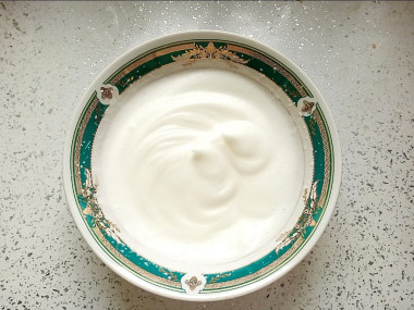 В миске взбейте белки с щепоткой соли до получения воздушной пены. Белки должны быть холодные без примеси желтка, а посуда, в которой они хранятся и взбиваются, чистой, без капелек воды. Если хоть одно из этих двух условий будет нарушено, то белки в пену не взобьются. Подробнее об этом в статье в конце рецепта. Продолжая взбивать, частями добавьте сахар и ванильный сахар. Добавьте йогурт и аккуратно перемешайте лопаткой до однородности.