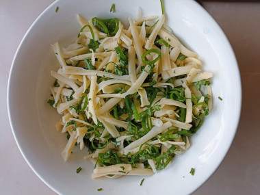 В миске соедините измельченную зелень и сыр и перемешайте. Предварительно попробуйте сыр на вкус. Если он достаточно соленый, специи можете не добавлять. Если нейтральный по вкусу, то начинку можете дополнительно посолить и поперчить.