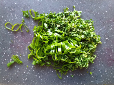 Всю зелень вымойте, обсушите и мелко порубите. Смесь трав можете подбирать по своему вкусу. У меня укроп, кинза и петрушка. Также возможны варианты с зеленым луком, базиликом, черемшой и т. д.
