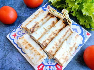 Подавайте лаваш с сыром и зеленью в горячем или теплом виде. Приятного аппетита!