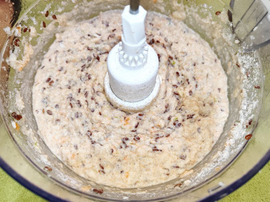 Затем, в блендер отправила лук, морковь и чеснока пару маленьких зубочков. Сюда же выложила семена льна, которые за ночь пустили кисель. Измельчать в кофемолке не стала, для меня зёрнышки в фарше не критичны. Муку вмешала тоже в блендере в эту кисельно-овощную массу.