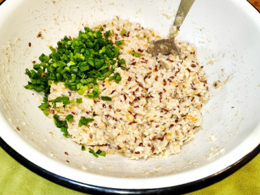 Соединила оба замеса, добавила мелко нарезанный зелёный лук, соль и специи (у меня все специи по рецепту). Хорошо вымесила фарш. Он получается плотный, котлеты формируются легко, даже сухими руками легко работать. Мне нравится ещё, что мука в рецепте цельнозерновая.