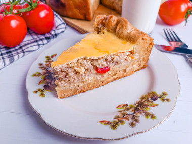 Готовый пирог переложите на блюдо, нарежьте на кусочки и подавайте к столу. Приятного аппетита!