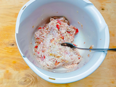 В миске соедините фарш, болгарский перец, майонез и специи и тщательно перемешайте до однородности.