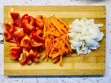 Отправьте нарезанный перец в сковороду к луку и моркови. По желанию можете добавить острый перец чили.