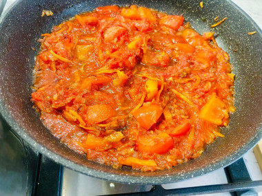 К овощам добавьте томатный соус. У меня был готовый. Можно заменить соус на свежие или замороженные помидоры, томатный сок или томатную пасту, разведенную водой. Тушите примерно 5 минут.