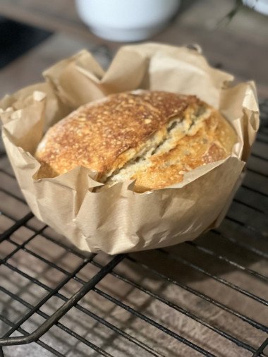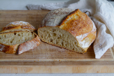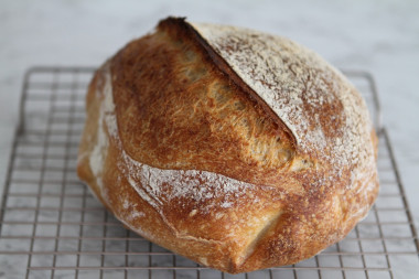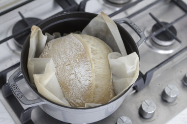 Переложите пергамент с заготовкой на горячий противень и накройте ее горячим колпаком. Пеките хлеб 15 минут в таком виде, затем колпак снимите, температуру уменьшите до 200°С. Продолжите выпекать еще 15-20 минут, до золотистой корочки. Точное время будет зависеть от особенностей вашей духовки. Подробнее об этом читайте в отдельной статье, ссылка в конце рецепта. Готовый хлеб аккуратно переложите на решетку и полностью остудите.