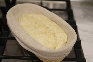 Получившуюся заготовку уложите в миску или специальную корзину для расстойки, выложенную салфеткой. Обязательно присыпьте ткань мукой. Тесто выкладывайте швом вверх. Накройте миску пленкой, я еще дополнительно обхватила ее резинкой. Уберите в холодильник на 6-10 часов.