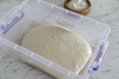Перемешайте, накройте миску с опарой пищевой пленкой и оставьте на 6-8 часов. За это время опара увеличится в размере и пойдет пузырями.