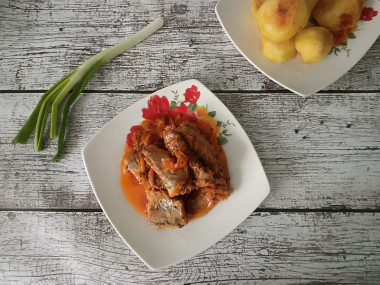 Залейте рыбу разведенной томатной пастой, доведите до кипения, посолите. Тушите рыбу на слабом огне примерно 20 минут.