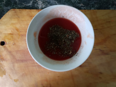 Томатную пасту разведите водой, добавьте паприку, базилик, черный молотый перец. Специи и приправы выбирайте по желанию на свой вкус.