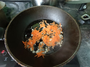 Выложите на сковороду к луку морковь, перемешайте. Обжарьте овощи, периодически помешивая, до средней мягкости.