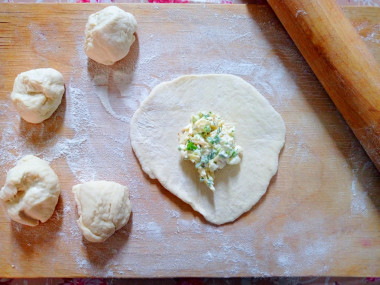 Колобок из теста раскатать в лепешку, в центр положить начинку, разровнять. Углы теста залепить к центру. Затем перевернуть швом вниз и очень аккуратно раскатать в лепешку. Лепешка должна увеличиться не меньше чем в 2 раза.