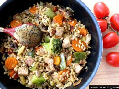 5. Добавить к мясу овощную смесь и перловку. Посолить, поперчить и добавить овощной бульон. Накрыть крышкой и потомить минут 5-7 до выкипания жидкости и готовности перловки.