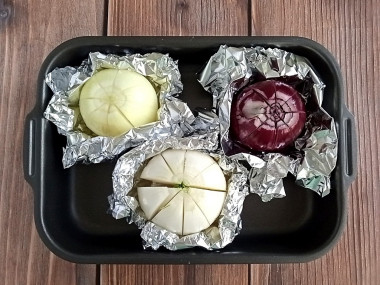Вот теперь заверните лук полностью, стараясь, чтобы в фольге не осталось отверстий. Уложите получившиеся шарики их фольги в форму для запекания. О нюансах использования фольги читайте в отдельной статье по ссылке в конце рецепта.