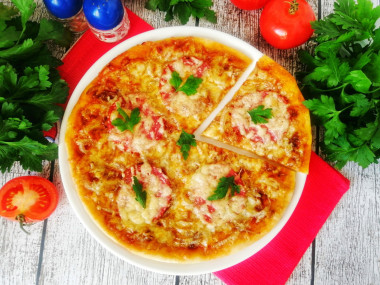 Готовую пиццу достаньте из духовки, нарежьте на порции и сразу подавайте к столу. Приятного аппетита!