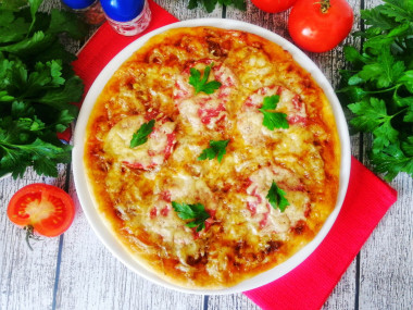Какая же это вкусная пицца! С тонким хорошо пропеченным мякишем и хрустящей корочкой, с простой, но очень аппетитной начинкой!