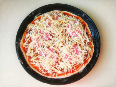 Запекайте пиццу в заранее разогретой до 190-200 С духовке примерно 15 минут. Сыр должен расплавиться, а краешки пиццы слегка зарумяниться. Время и режим выпечки могут отличаться. Устанавливайте их, ориентируясь на особенности работы своей духовки. Полезную информацию на эту тему читайте в статье по ссылке в конце рецепта.