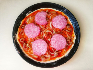 Когда тесто подошло, раскатала его и переложила в сковородку. Смазала заготовку соусом, добавила обжаренный лук, колбасу и сыр.