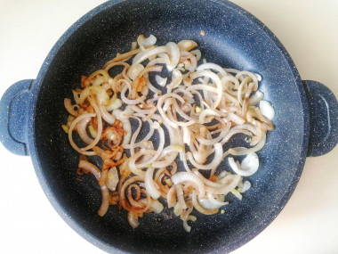На сковороде с добавлением растительного масла обжарьте лук, периодически помешивая, до готовности. Овощ должен стать мягким.