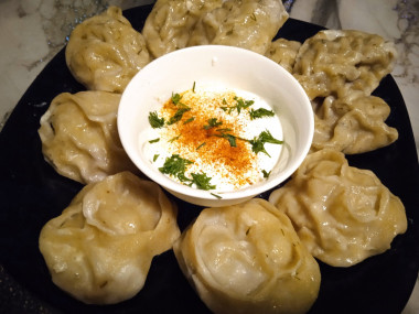 Манты с мясом и картошкой сочные готовы. Подавайте их с зеленью, сметаной, томатным соусом. Приятного аппетита!